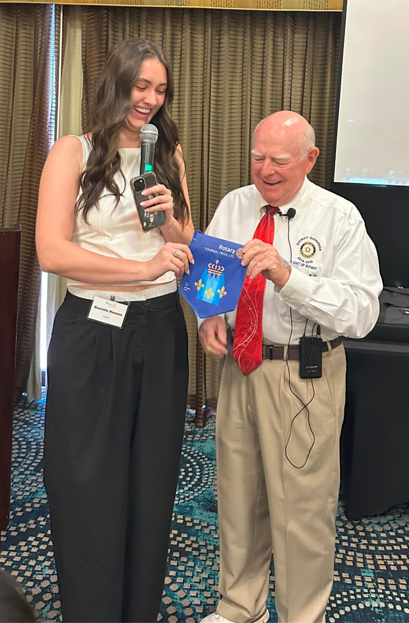 John Pennypacker accepted a banner she brought back from her host club and gave her a speaker appreciation gift.