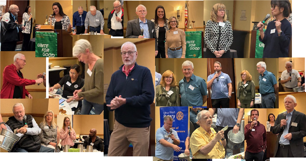 Next, Blaise Vitale was inducted into Mesa West Rotary. Andy Bradford was his sponsor, and Blaise’s wife, Suzanne, pinned Blaise with his new Rotary pin. Guests, Happy Bucks, and Club Member announcements were done at the same time to streamline activities. Andy Bradford did all of these tasks today.
