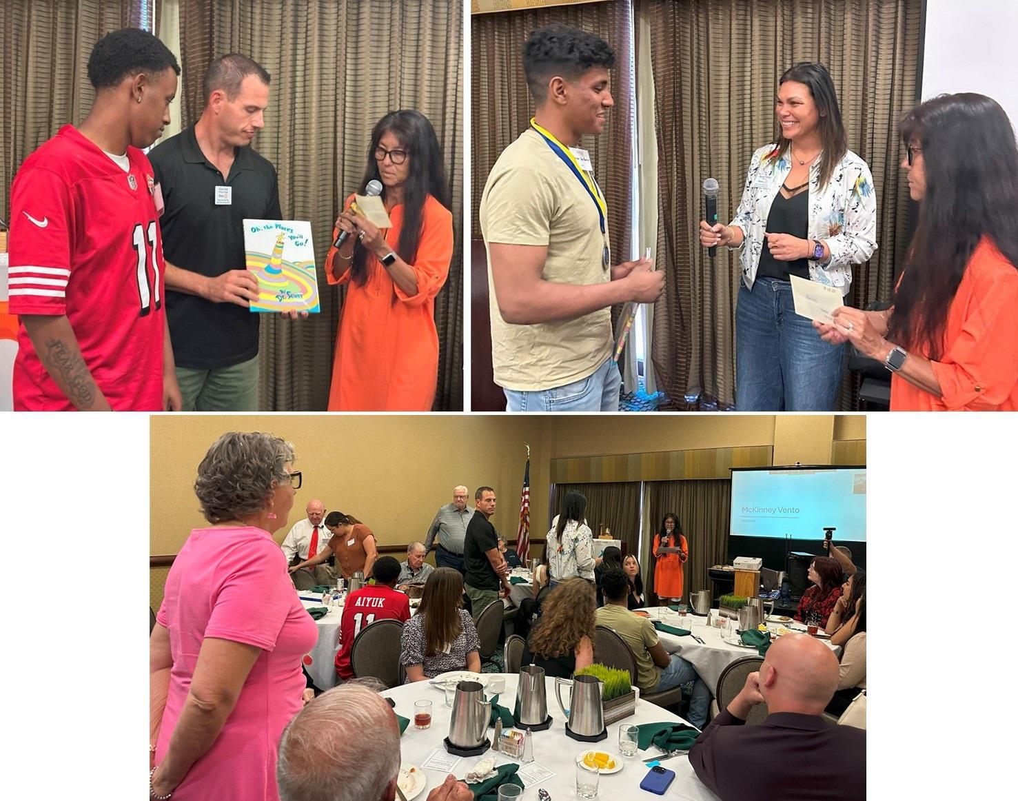 Rotary Builds Bridges - Colleen Coons Colleen asked all the adults, graduates and mentors who had been involved with the program to stand, saying, "Together we do. Together we thrive." In a quick overview, she said there were eleven students in the program this year. Five of them graduated. Two of them were at the meeting. One will graduate in August. Five students were juniors and will be going on to 12th grade next year. The program was 100% successful. She thanked Justin Hart for his very generous donation to the program. Roy, with his mentor, Justin went to the front of the room where Roy was given a medal, and the Dr. Seuss book, Oh, the Places You'll Go. He was also given a $100 stipend for graduating. Roy said he appreciated the program and said he probably would not have graduated without the program. Omran went to the front with his mentor, Kayla. Kayla said he has a very packed schedule. Omran said he will be going to ASU and will major in biology. He very much appreciated the help he received through the program. |