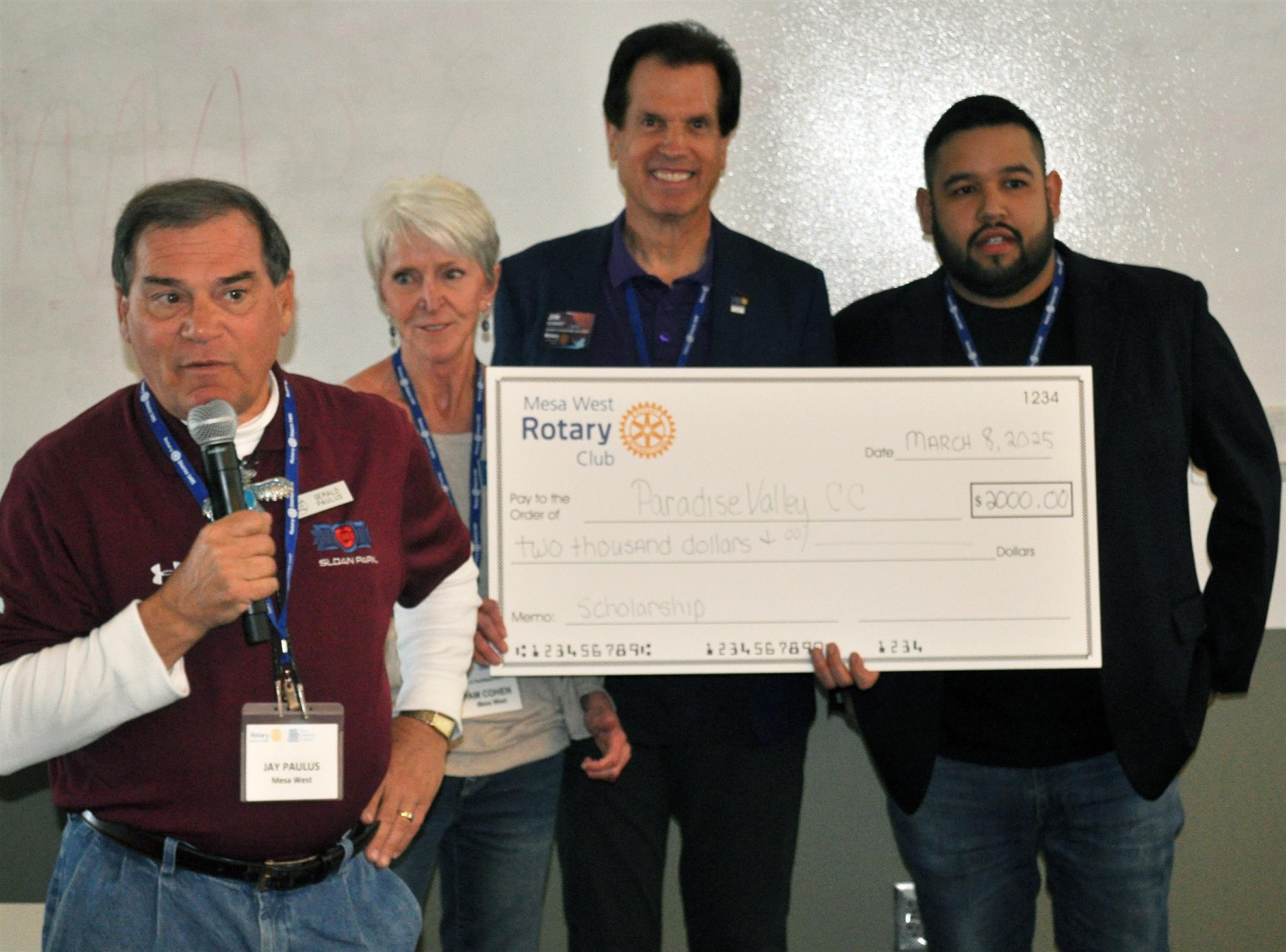 At the Club Leaderhip Academy held by District 5495 at Paradise Valley Community College on March 8, Mesa West President, Jay Paulus was joined by Mesa West Rotary Foundation President Pam Cohen and our soon-to-be District Governor member Jim Schmidt in presenting a $2,000 donation from Mesa West Rotary Foundation to Paradise Valley Community College (PVCC) for their scholarship fund for students in need. The donation was presented to Mario Marquez, who is a Senior Development Officer with PVCC in their Office of Strategic Partnerships. Mario is a member of the Rotary Club of Paradise Valley. Mario gave a shout out to The Rotary Vocational Fund of Arizona (TRVFA) for the grants they have provided to benefit students in vocational programs at the college.