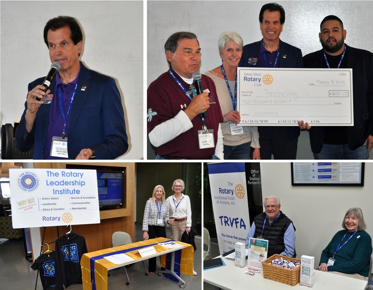 Saturday, March 8, Mesa West Rotarians were visible. Jim Schmidt was very much in the spotlight as the Club Leadership Academy is all about training club volunteers for their roles in the coming year, which will be Jim's year as District Governor. During the opening session, Jay Paulus as Mesa West Rotary Club President and Pam Cohen as Mesa West Rotary Foundation President Joined Jim in presenting a check to Mario Marquez for the Paradise Valley Community College Foundation to support scholarship(s) for one or more students in need. Mario is a Rotarian who is on staff at PVCC and was instrumental in making their facility available for CLA and helping arrange catering for the event, while keeping costs at an affordable level. Mario gave a shout out to The Rotary Vocational Fund of Arizona for the grants TRVFA has provided for some of their nursing students.
