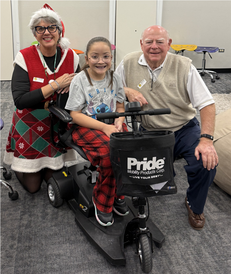 Deb Koeneman announced the December Rotarian of the Month, who is Jim McGowen. John Pennypacker told the story of how Jim McGowen procured an electric wheelchair for a local 10-year old girl in December, and also awarded Jim McGowen with his Paul Harris plus 4 pin. The picture below shows Connie Bunyard and John Pennypacker delivering the chair.